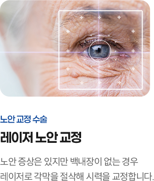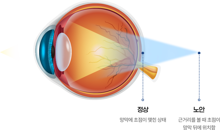 노안은 노화현상으로 수정체의 탄력성이 떨어져 발생합니다.